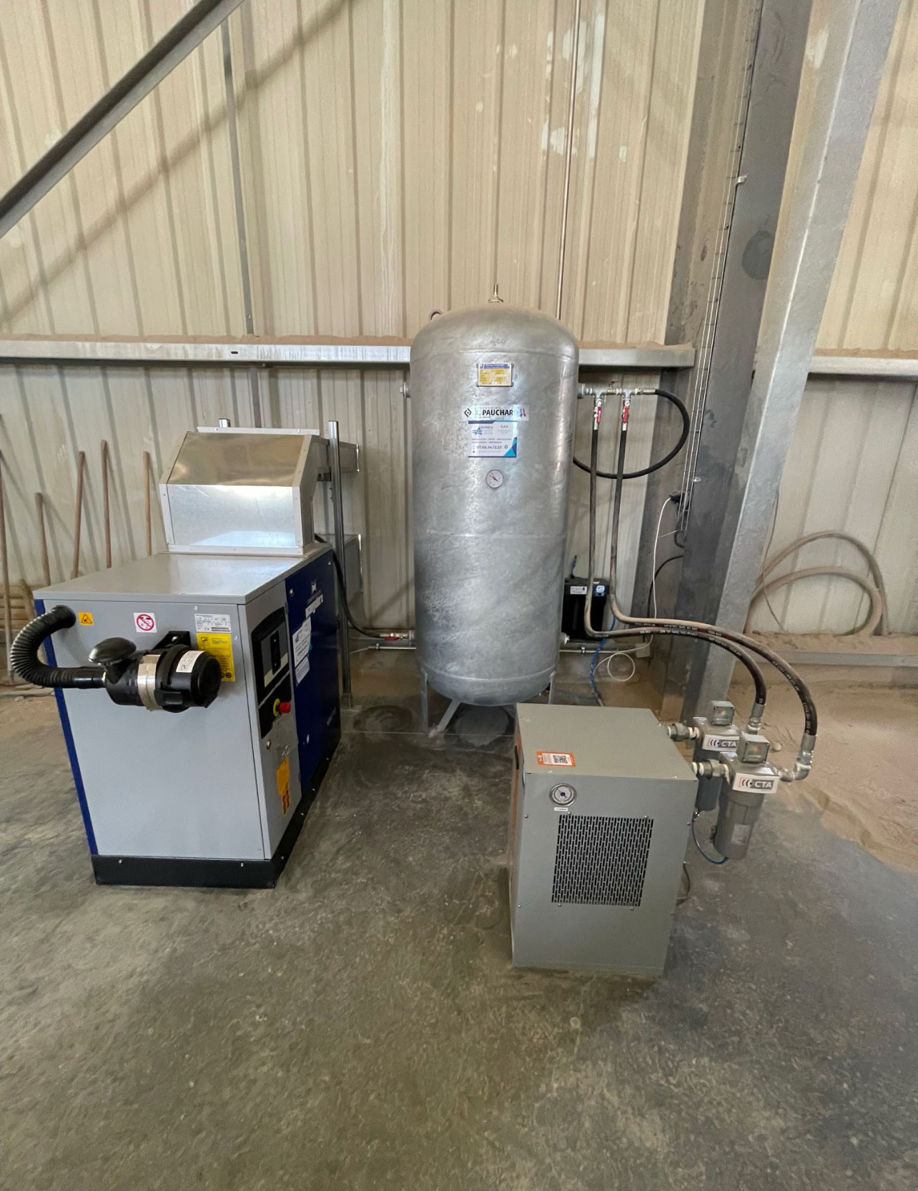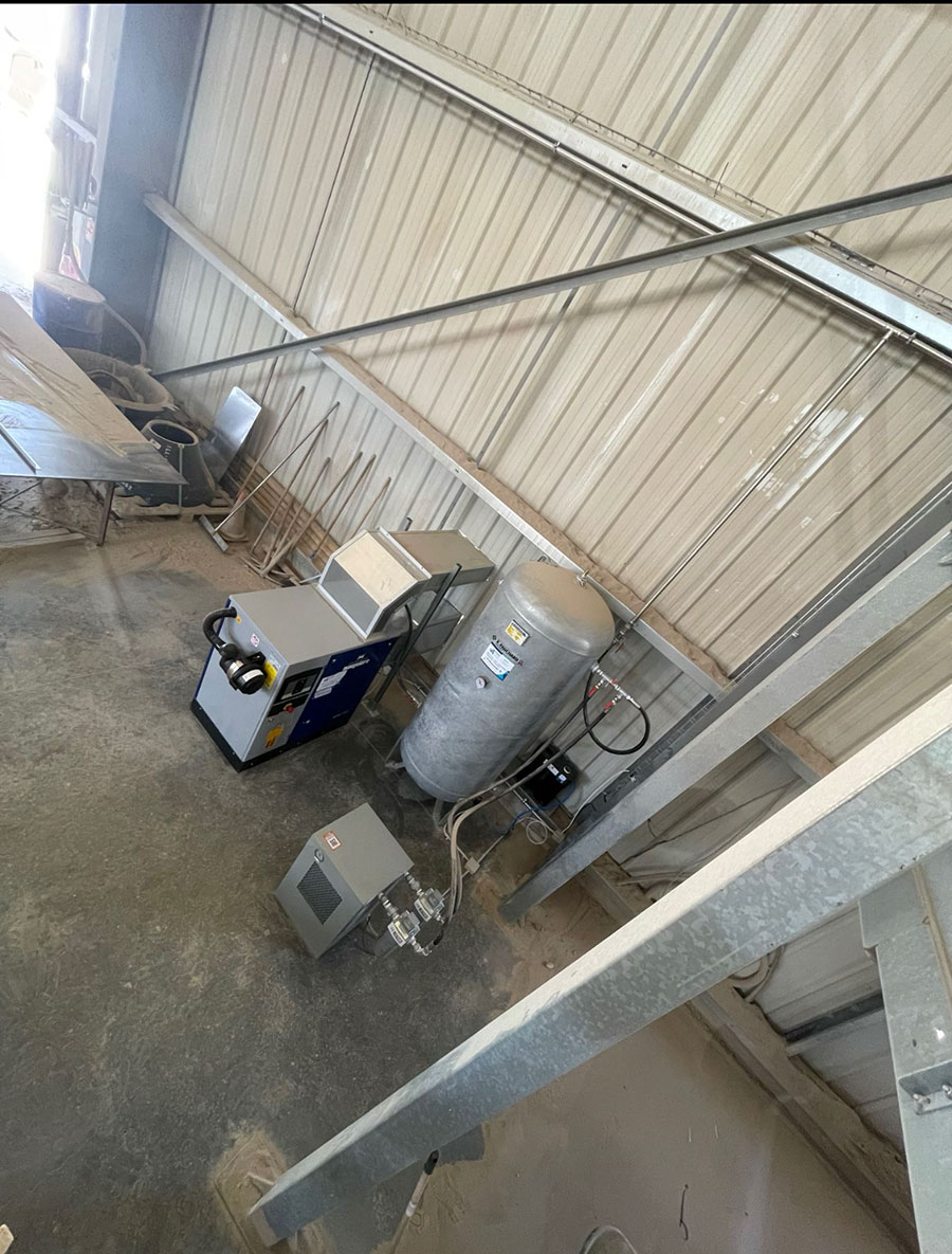 3. Installation du compresseur d'air Mauguière : Le compresseur Mauguière MAV 151 a été installé avec soin. Sa puissance de 11 kW et sa pression de 10 bars en font un élément essentiel de la centrale d'air comprimé. En option, un filtre saharien a été ajouté pour éviter l'aspiration de poussière et garantir la longévité du compresseur.
